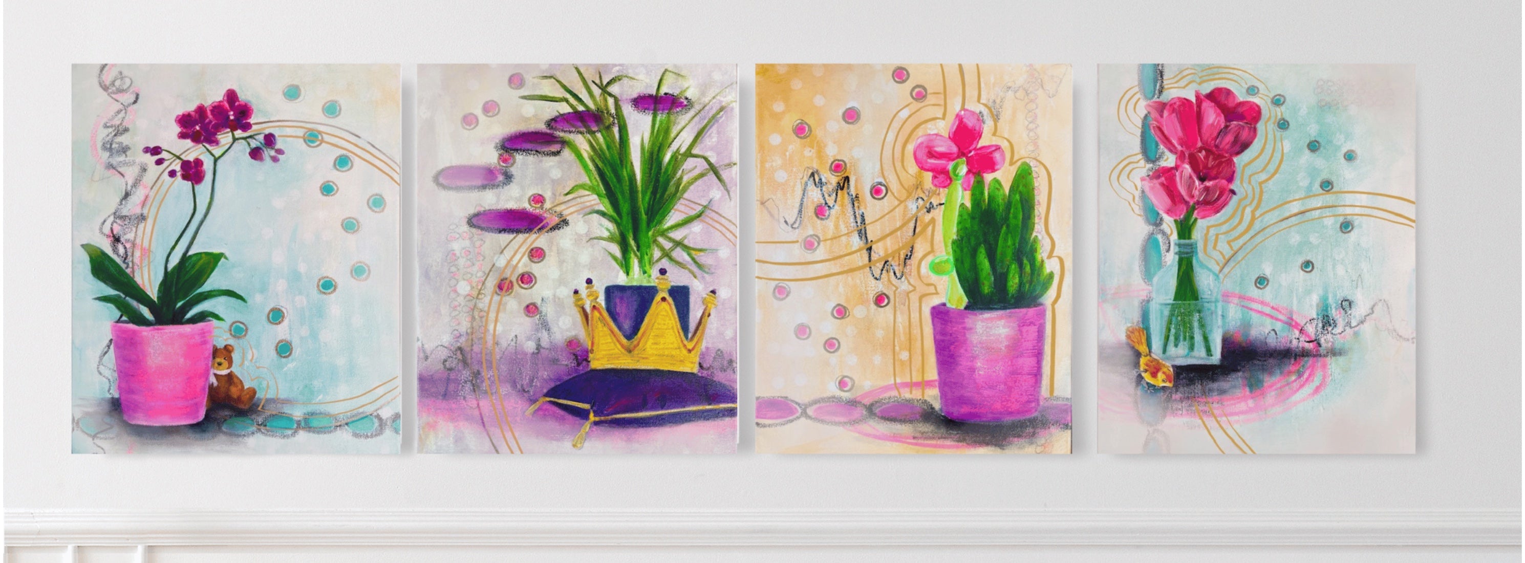 Step out of the realm of traditional botanicals with these happy, lighthearted paintings designed to delight and made to amuse!